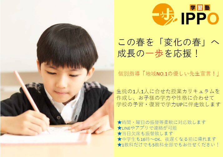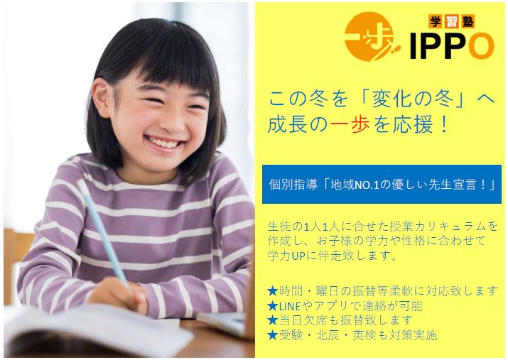 生徒の成長を創出する、そのきっかけになる最初の「一歩」を作り出したい。生徒の将来最初の別れ道であり、人生のターニングポイントである高校受験の進路に関わる大事な一歩をきちんとした「一歩」にする為の あと押しができる塾にしたい!と想い学習塾IPPOという名前にしました。