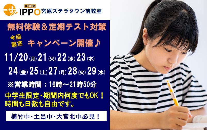 上記期間にてテスト対策講座を実施します。期末テストに向けて一緒に点数UPを目指していきます。日付・時間・教科は自由に選べる無料体験になっております。その後興味を持ってもらえたら面談をさせてもらい入塾手続きをさせてもらいますので、今回の「対策講座のみ」の参加でも全然問題ありません♪今回限定のキャンペーンになりますのでこのチャンスに是非ご参加ください!